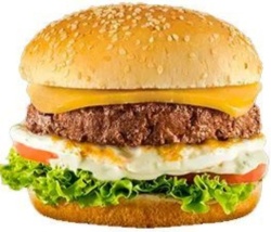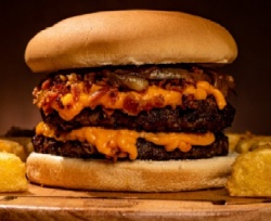 Pão, 2 blend bovino 150g, 2 camadas de cheddar fatia, bastante bacon, 4 cebola empanada e molho da casaEXPLOSÃO DE CHEDDAR