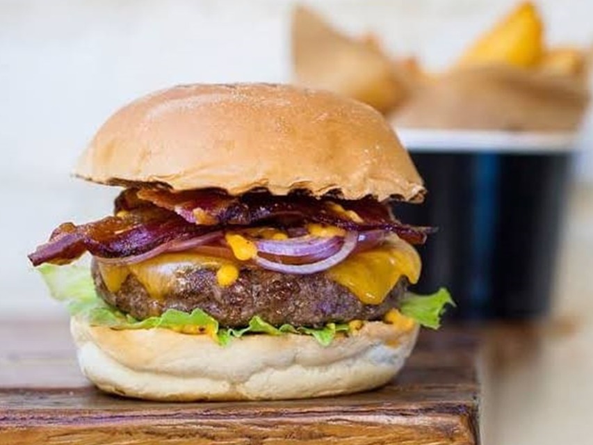 Pão, blend bovino 150g, cheddar fatia, bacon, cebola caramelizada e molho da casa