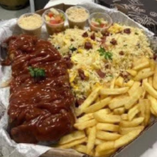 Arroz maluco, vinagrete, farofa, fritas e Costela.