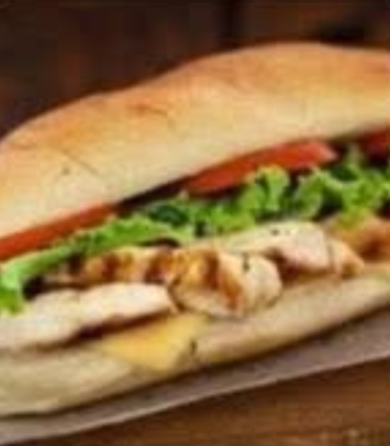 Pão artesanal de Provolone, frango, bacon, tomate, cebola, alface e molhos