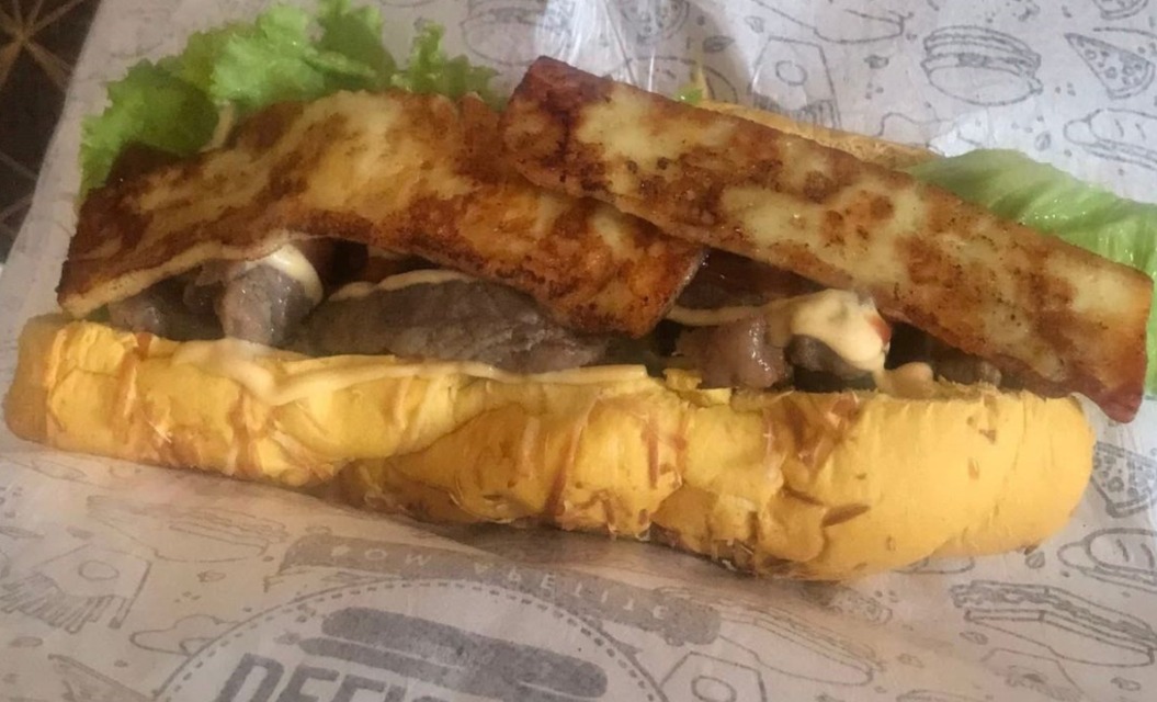 Pão artesanal de Provolone, contra filé, vinagrete, queijo coalho, alface e molhos